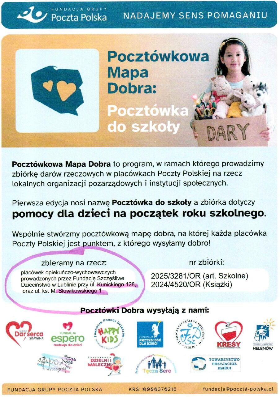 Już w czwartek, 11 września 2025 r. w naszej szkole odbędzie się kiermasz charytatywny, z którego dochód przeznaczymy na zakup wyprawek szkolnych i książek dla dzieci z placówek Opiekuńczo-Wychowawczych w Lublinie (ul. Kunickiego i ul. Słowikowskiego 1) - w ramach wsparcia akcji #pocztówkowamapadobra