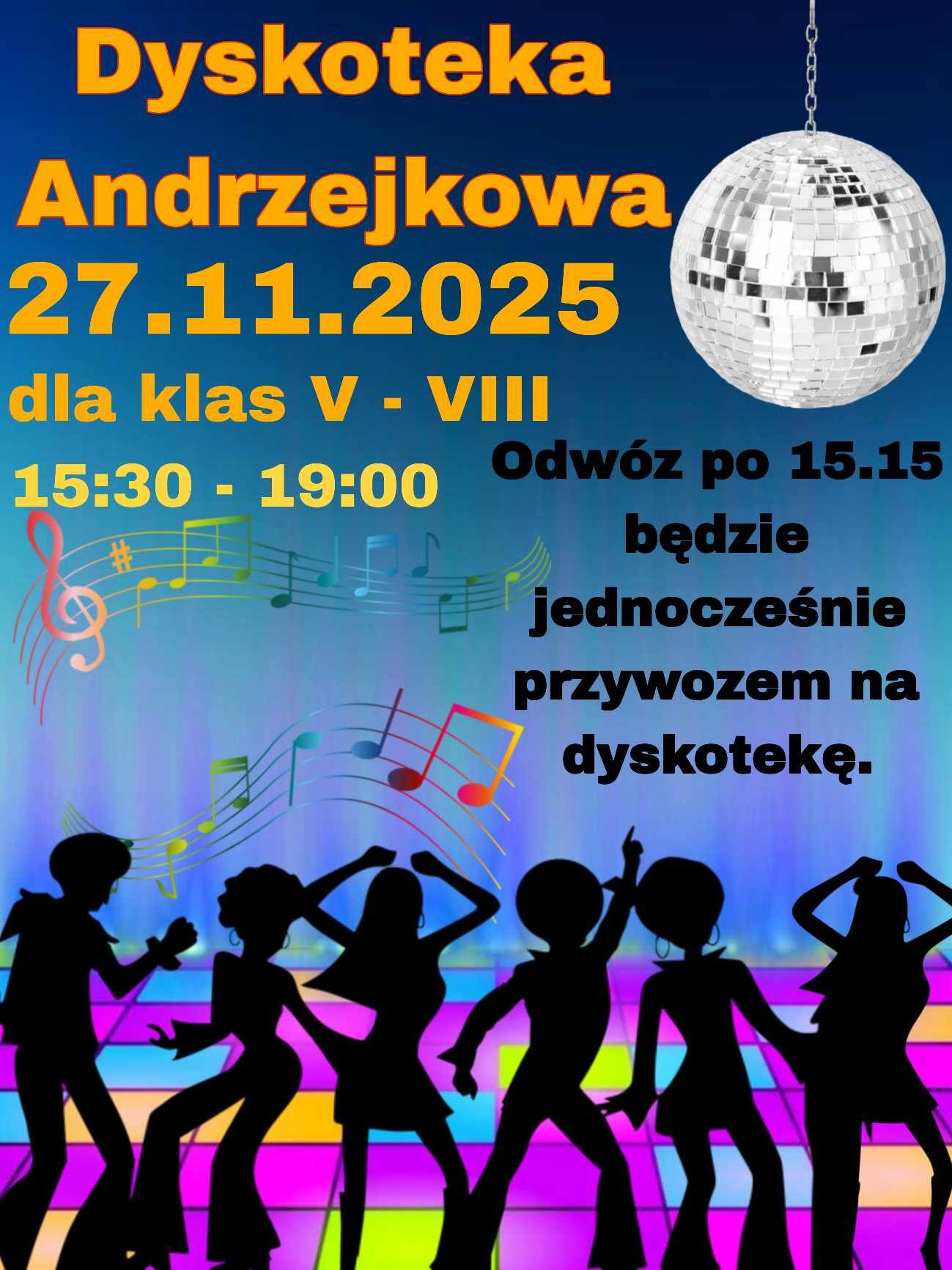 Drodzy Uczniowie! Samorząd Uczniowski zaprasza na dyskotekę andrzejkową! 🥳😎 Bawimy się w czwartek, od 15.30 😁🕺💃 a na dobre rozkręcamy się od 16.00 - jak wszyscy dotrą - ostatni odwóz będzie jednocześnie przywozem na dyskotekę.