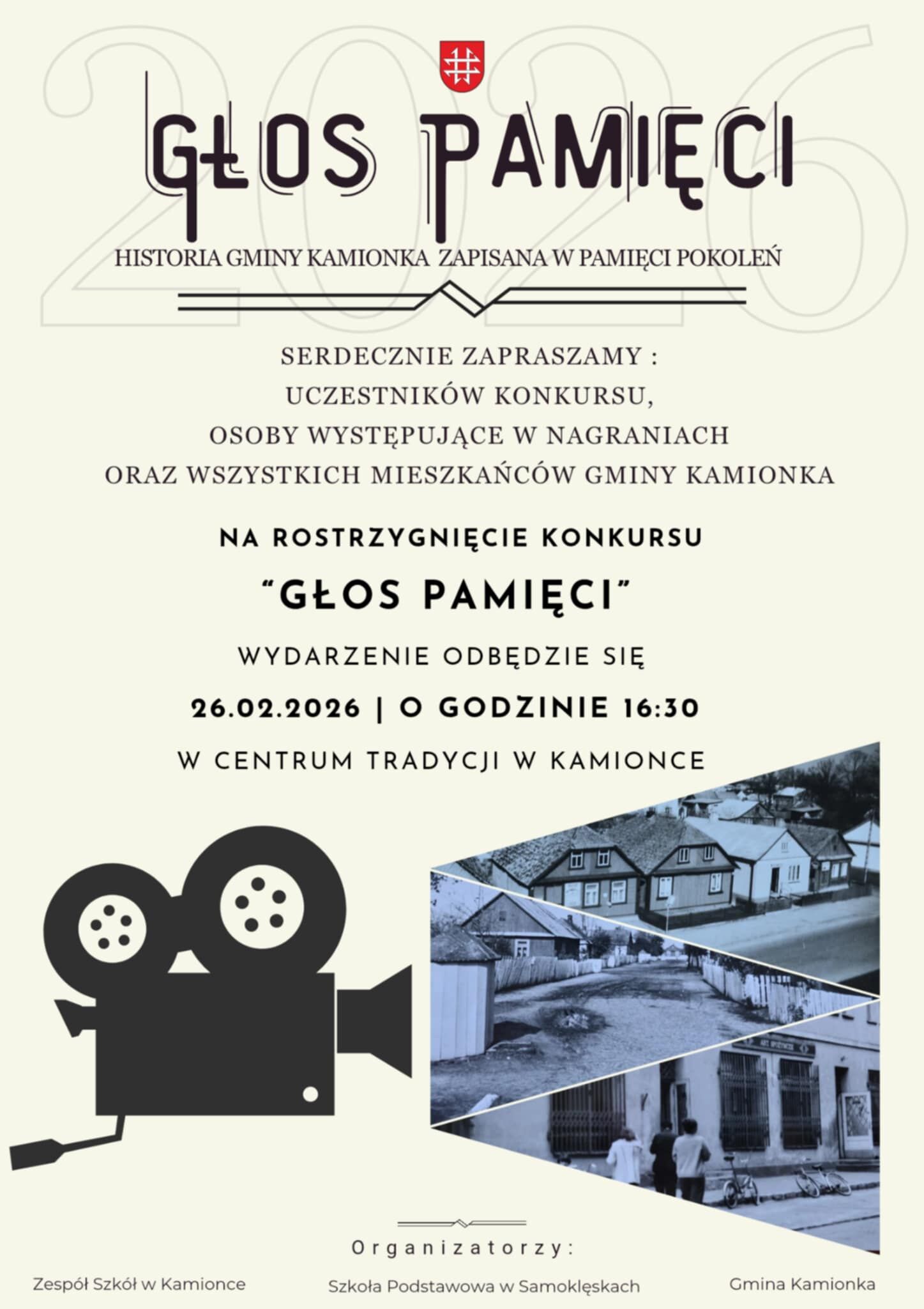 Serdecznie zapraszamy uczestników konkursu "Głos pamięci. Historia Gminy Kamionka zapisana w pamięci pokoleń", osoby występujące w nagraniach oraz wszystkich mieszkańców Gminy Kamionka na rozstrzygnięcie konkursu. Wydarzenie odbędzie się 26 lutego 2026 r. o 16.30 w Centrum Tradycji w Kamionce.